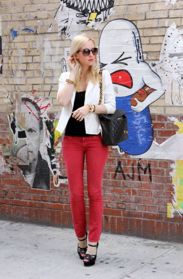 Çanta, ayakkabı ve bluz'un uyumu oldukça hoş gözüküyor. Renkli pantolon, canlılık ve dinamizm katarken, sade ceket kombini dengeliyor.